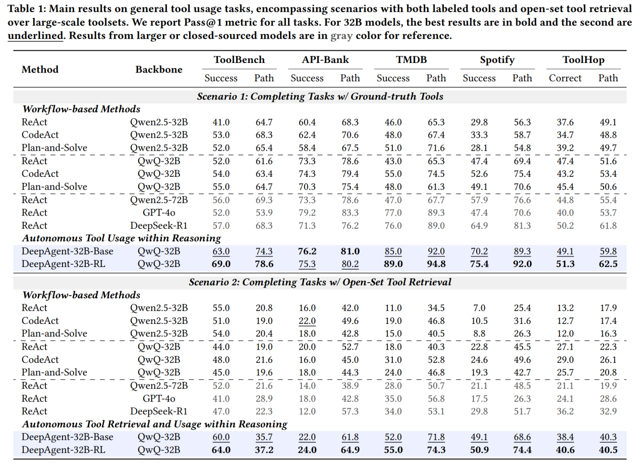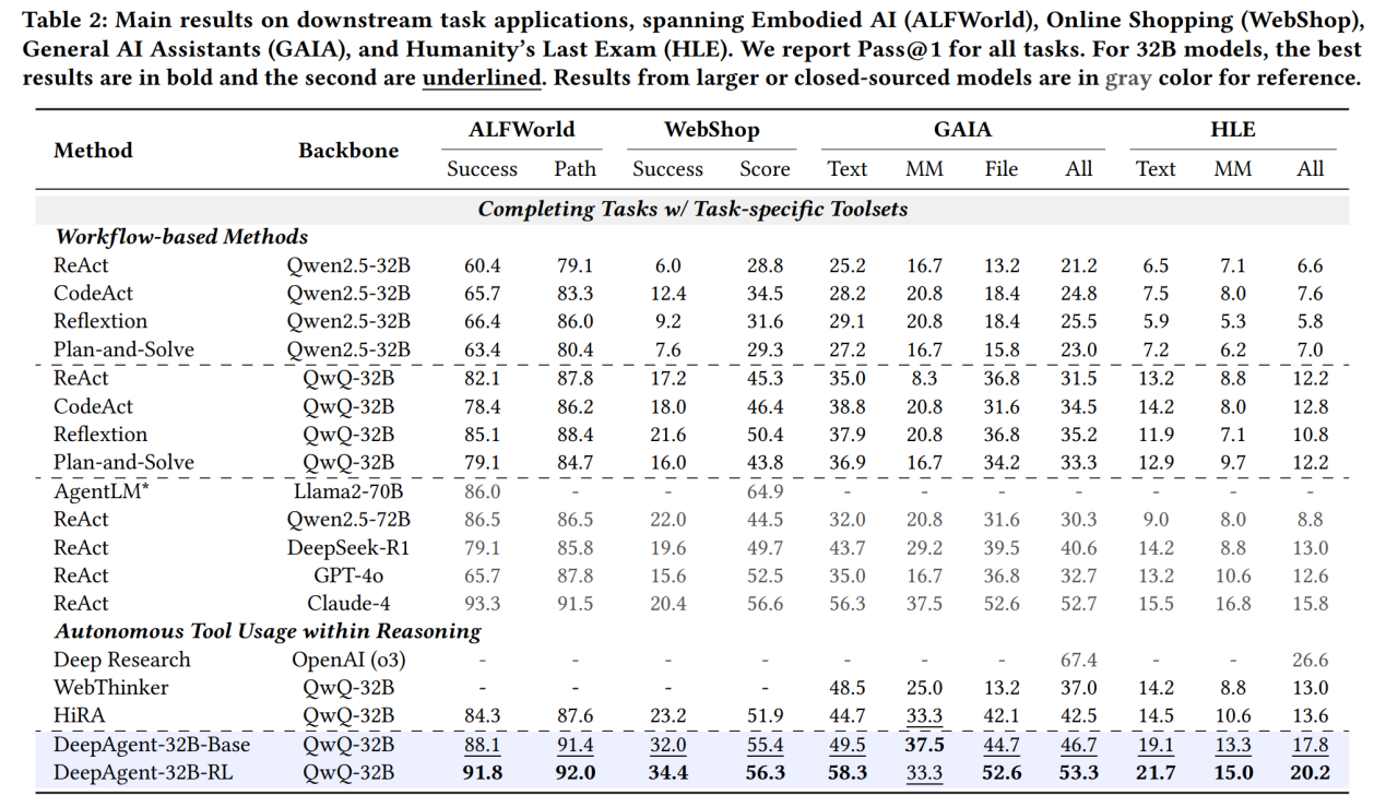 在八大基准测试中,DeepAgent在绝大多数任务上全面领先所有基线模型。